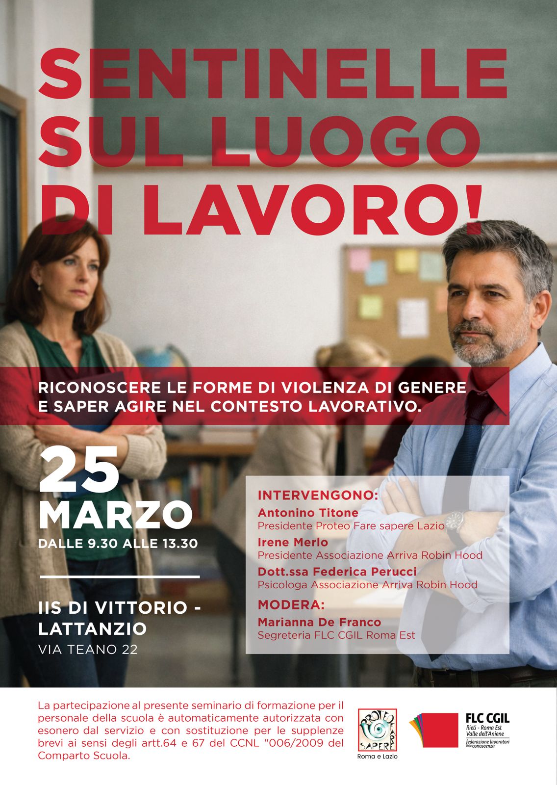 La Flc Cgil Rieti Roma Est valle dell’Aniene, in collaborazione con l’Associazione Proteo Fare Sapere Lazio, organizza un Seminario Formativo per i docenti e personale ATA dal titolo “Sentinelle sul luogo di lavoro “Riconoscere le forme di violenza di genere e saper agire nel contesto lavorativo”. Il Seminario si svolgerà il giorno 25 marzo 2026 dalle ore 9 alle ore 13,30 presso IIS Di Vittorio Lattanzio, in via Teano 22.